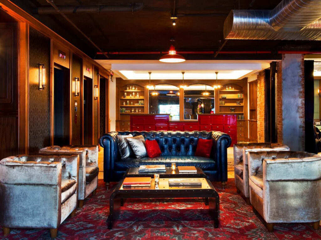 この改修で、変わった形状のロビーは最大限に生かされ、魅力的な4つのエリアに分けられました。バー、ラウンジ、チェックインスペース、そしてライブラリー。バーには、天井からぶら下がるメタルフレームのガラスキャビネットとたくさんの座席、隣接するラウンジでは、ベルベットの椅子に陣取り、赤いグランドピアノの音色に耳を傾け、その奥には控えめなチェックインデスク、そして、巨大なフラットパネルテレビや共用のテーブルを備えたレンガ造りの図書館がNYらしさを演出します。俳優、作家、ダンサー、演奏家、それにファミリーも、誰もが楽しめる空間を創り出しました。
