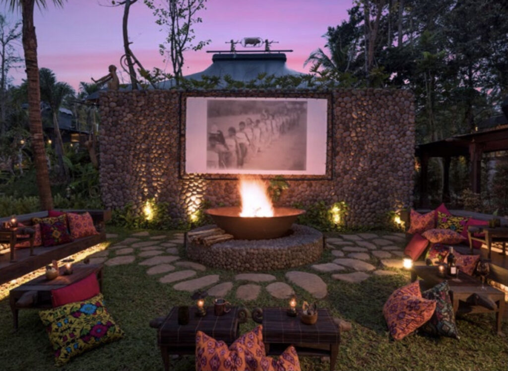 ディナーの後はキャンプファイヤーを囲み、モノクロの古き良き時代のバリ島の映像を見ながら、焚火で炙ったマシュマロを食べながら過ごすというのも楽しい。