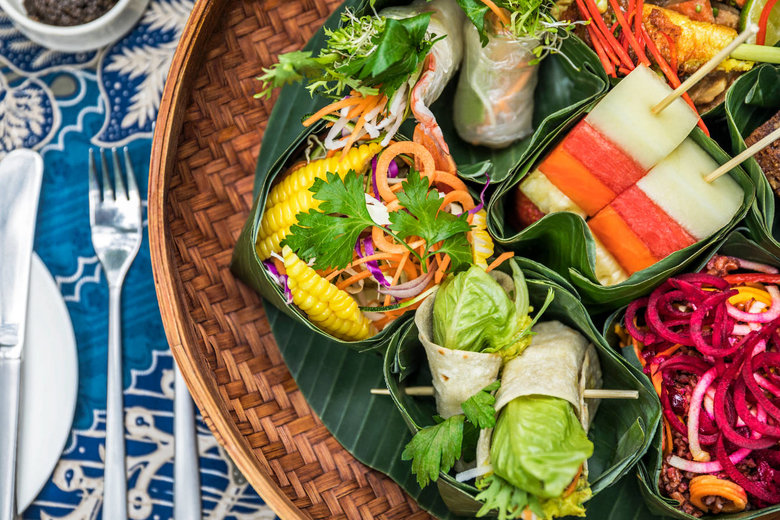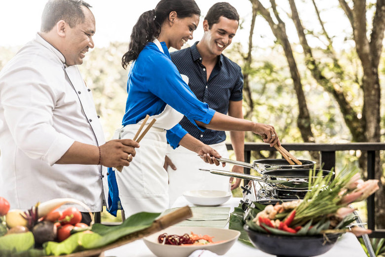 レストランは「クドゥス(KUDUS)」と「グル―(GLOW)」のふたつ。「クドゥス」は朝食とディナーが楽しめるインドネシア料理中心のレストラン。ジョグロスタイルと呼ばれる住居をジャワ島から運び再び組み立てたという、アンティーク感満載の絶景レストランです。「グロー」は、オールデーダイニングで、コモ・シャンバラキュイジーヌをはじめヘルシーメニューが中心。ランチとディナーで利用でき、オーガニック野菜を使ったベジタリアンメニューなどが充実していますが、チキンや魚の料理も大丈夫です。
