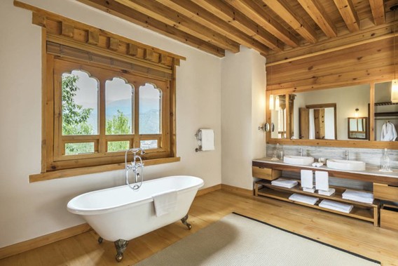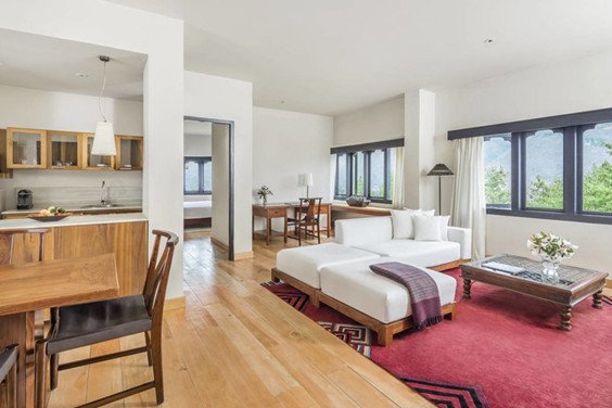 壮大な山風景に囲まれたウマ・パロですが、ここのいち押しは「ワンベッドルームヴィラ」。ヴィラ形式の部屋は全9室で、そのうち8部屋を占めるワンベッドルームヴィラは、92㎡というゆったりとしたスペース。正面の玄関を開けると広いリビング、そして正面にはブータン様式の暖炉窓が。ヴィラにはバトラーサービスが提供されており、ストーブに火をつけてくれたり、コーヒー淹れてくれたりなど、いかなるリクエストにも応じてくれます。ヴィラのほか、本館には20部屋のスーペリアからスイートまでの部屋も用意され、窓からはパロ谷が一望できます。