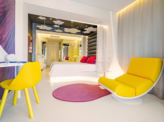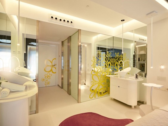 さて、そのフォルメンテラ島に、今年5月、新たな5つ星ラグジュアリーホテルがオープンしました。Five Flowers Hotel & Spa Formenteraです。島の北東部、海岸から250mほどのところにあるこのホテルは、その名のとおり、60年代に流行った“フラワーチルドレン”に代表されるヒッピー文化をコンセプトにデザインされているのです。当時のヒッピーたちは、平和と愛の象徴として花で身体を飾っていたのですね。そんなわけで、インテリアはかなりサイケな感じですが、ファッションは繰り返すというわけで、なかなか快適な住空間となっています。部屋は全部で79室、6つのカテゴリーに分かれています。好みの枕をチョイスできたり、ベッドは2.2mの円形ベッドかキングサイズのベッドを指定できたりと心憎いサービスも。全室テラスが用意されており、お洒落なライティングなど、現代的だけど暖かい雰囲気、これはお気に召すこと間違いなし。