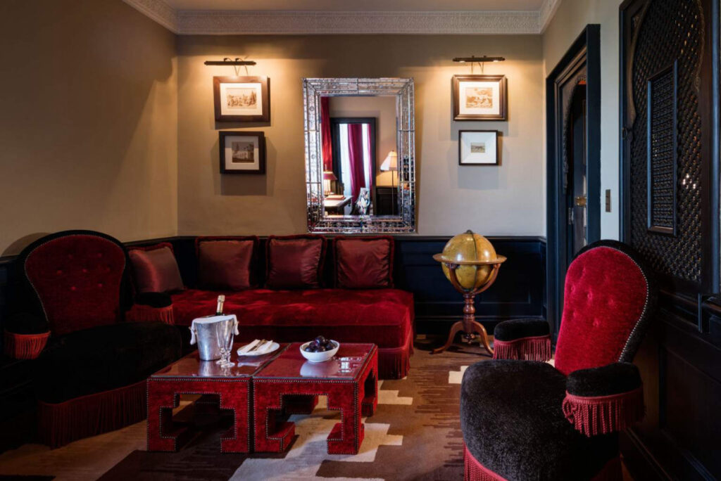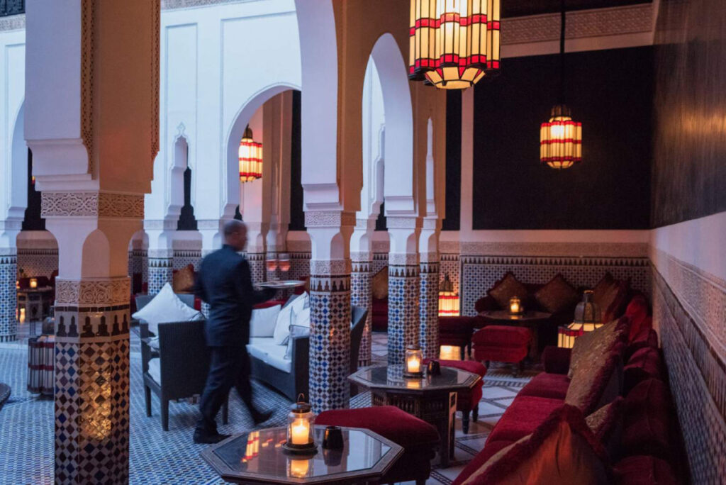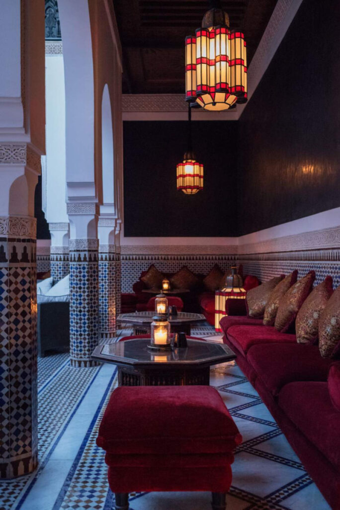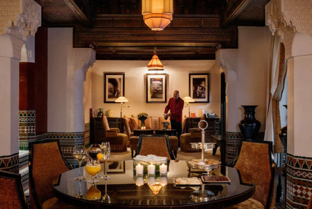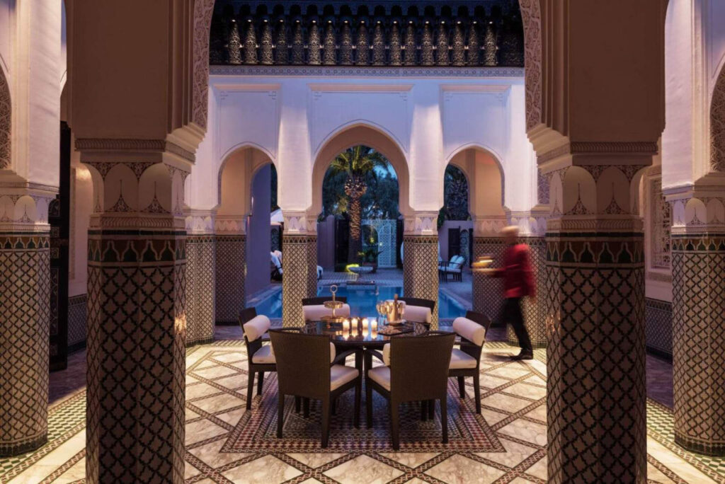 現状、135の客室、71のスイート、3棟のリアド(モロッコ風邸宅)があります。やはり人気のリアドに泊まりたいところ。リアドとは、アラビア語で“植物のある庭”という意味ですが、モロッコでは中庭付きの邸宅のことを指すようです。それゆえリアドの中庭は、豪華で、大理石のパティオ、中央にはブルーのタイルが敷き詰められたプールが。パティオを囲むように作られた広さ700㎡の3つのスイートルームは、ダイニング、屋内ラウンジ、キッチン、そして暖炉つきのベッドルームと、まさに宮廷を思わせる贅沢な造りです。