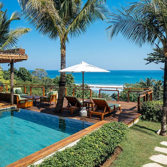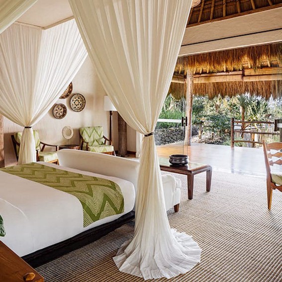 海に向かって傾斜する270ヘクタールの土地(東京ドーム58個分)には、バーチが最初に土地を購入した頃は貧弱な部屋が12しかありませんでした。そこから約3千万ドルの資金を注ぎ込み、27のヴィラに38室のゲストルームを造り上げたのです。すべての部屋にはプライベートプールが用意され、さらにスパ棟と馬の厩舎もあります。