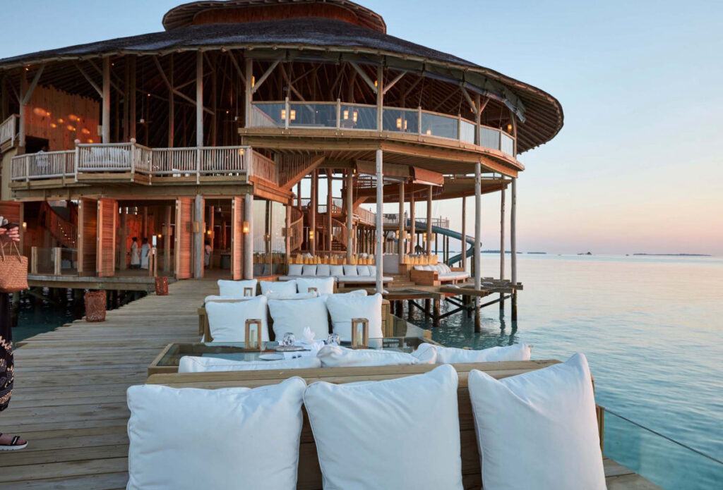 2階にあるバーの前にはカタマランネットが用意され、カクテル片手に夕陽を眺めるのに最適です。ソネバ・ジャニはヴィラに設置されたウオータースライダーが有名ですが、ギャザリングにはリゾート内で最大のスライダーがあり、2階から直接海に滑り込むことができます。3階にはライブラリーとプライベートダイニングルーム、Ice cream & chocolate roomがあります。