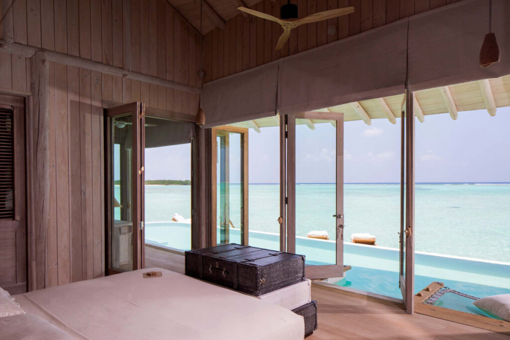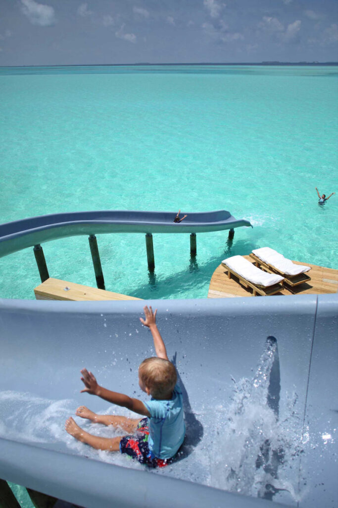ソネヴァ・ジャニには24の水上ヴィラ(400㎡以上)とひとつのビーチヴィラがあります。1.7kmの長さのジェティ(桟橋)に沿ってヴィラが並びます。ワンベッドルームから4ベッドルームまでのヴィラがあり、すべてのヴィラにはプールとウオータースライダー(一部を除く)が設置されています。2階からスライダーでインド洋に飛び込む爽快感は何度経験しても飽きません。一番大きなアイランドヴィラは、広さ1750㎡、大人8人と子供2人が宿泊可能です。プール、キッチン、ワインセラー、プール、サウナなどすべてがそろう超豪華なプライベートヴィラです。