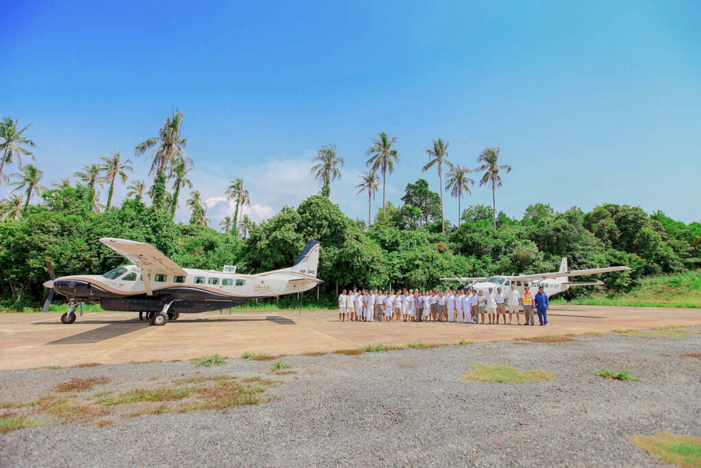 バンコクからはホテルが所有する8人乗りプライベートセスナ機(セスナ・グランドキャラバン)が手配されます。現地スタッフの手際のよさには驚きます。約70分のフライトで、隣接する島に着陸、あっという間に大都会から熱帯雨林のジャングルへというわけです。そこからゲストはスピードボートで5分のソネバ・キリへ上陸です。到着の瞬間から“ミスター(あるいはミス)・フライデー”と呼ばれるパーソナルバトラーが出迎え、ゲスト滞在中のすべてのお世話をしてくれることになります。(空での移動が苦手な方には車とボートでの移動も用意しています。)
