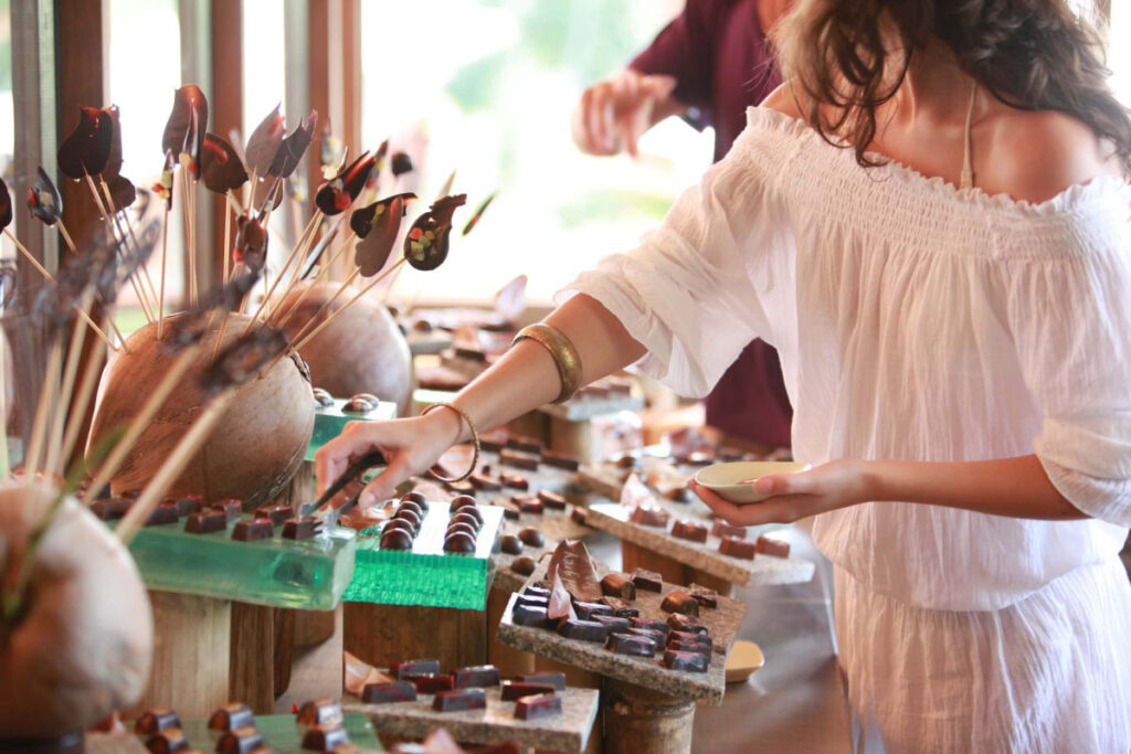 到着桟橋から、長い木製の通路で丘を登ると、メイン棟のリゾートセンターです。 ここには、レセプション、ライブラリー、バー(プール付き)、メインレストラン、ジュエリーギャラリー、ブティックショップ、チョコレート&アイスクリームパーラーがあります。すべてのアイスクリームとチョコレートは無料です(24時間年中無休)。「So Chilled」と呼ばれるアイスクリームパーラーでは、60種類以上の自家製アイスクリームとシャーベットのフレーバーからチョイスできます。隣接する「So Chocoholic」では、大人も子供もチョコレートの尽きない夢を満喫できます。