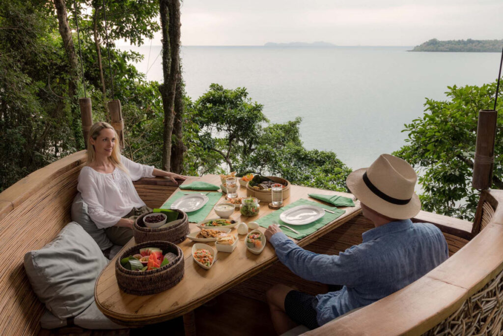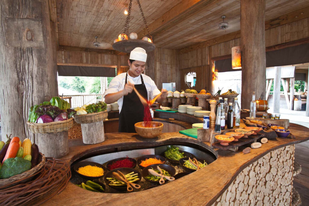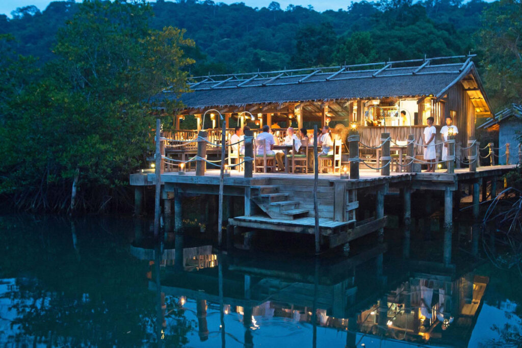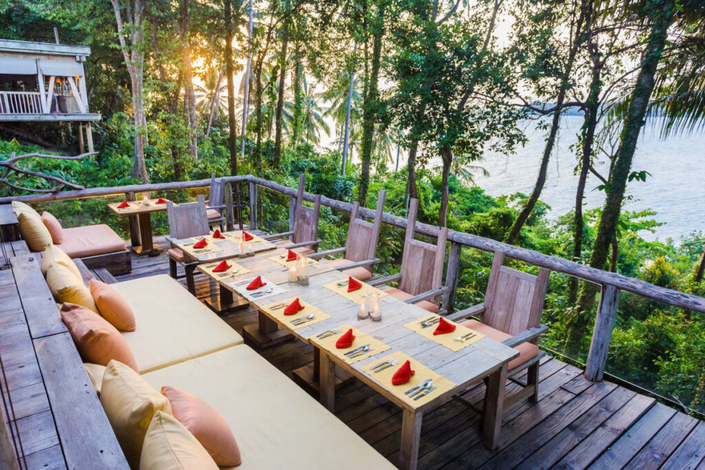 Benz’s―マングローブのなかにある高床式のランタン照明付きのタイ料理のレストランで、30年以上の経験を持つシェフ、ベンツさんが腕をふるいます。伝統的なタイ料理をご堪能ください。Dining Room―アジア料理、地中海料理、ヨーロッパ料理と豊富なメニューが揃います。チーズセクションとチョコレートセクションも。So Spirited―海を眺めながら、タパス料理と飲み物を楽しめるプールサイドのレストラン。Treepod Dining―予約必須の大人気空中レストランです。テーブルとソファの付いたゴンドラに乗り、地上から10m、木の上での食事です。給仕スタッフがターザンさながらアクロバチックな動きで食事を届けてくれるパフォーマンスも魅力です。The View―その名のとおり、素晴らしい眺めが自慢。サンセット時にはもってこいの展望レストランです。The Beach-ホテルからロングボートで約10分、ゲストオンリーのプライベートビーチでのダイニング。
