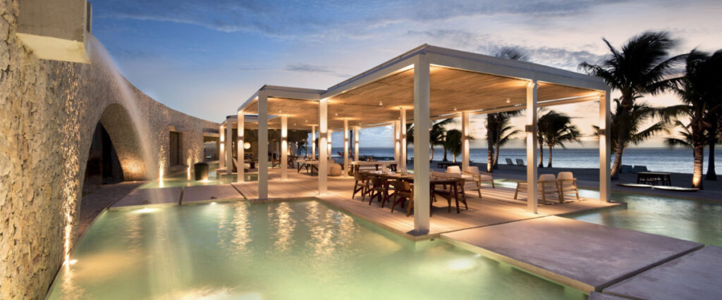 ビーチフロントのメインエリアは、ピアッツァあるいはヴィレッジと呼ばれます。アイボリーとライトブラウンを基調にしたニュートラルな色調で、ミニマリストなエレガンスでまとめられています。水、砂、風が絶妙にミックスしたデザインです。
