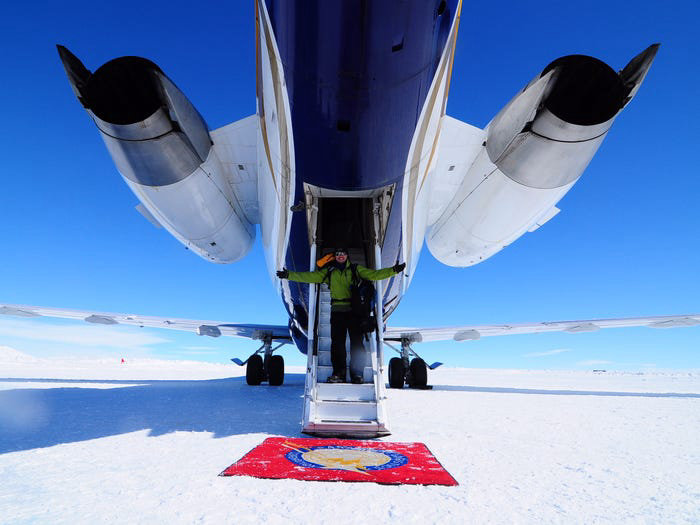 まずは、南アフリカのケープタウンからホワイトデザート社が所有するプライベートジェット、ガルフストリーム550で南極に向かいます。シャンパン片手におよそ5時間の空の旅です。真っ白なウルフスファング飛行場に着陸すると、次はちょっとレトロなDC3 Baslerに乗り換えて約20分、ついにベースキャンプであるフイッチアウェイキャンプに到着です。