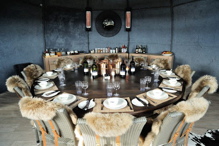 ゲストハウスのほかに、シャワーポッド、キッチンポッド、レセプション、ラウンジ、ダイニングルーム、カクテルデッキなどのカスタムテントなどがあります。ラウンジはカジュアルでとても居心地のよい空間です。ダイニングルームではオークの大きなテーブルを毛皮で覆われた椅子が囲んでいてフレンドリーかつゴージャスな雰囲気。ヘッドシェフのジャスティン・リンゼイはメルセデス・ぺトロナスのF1チームで働いていたという腕利きです。