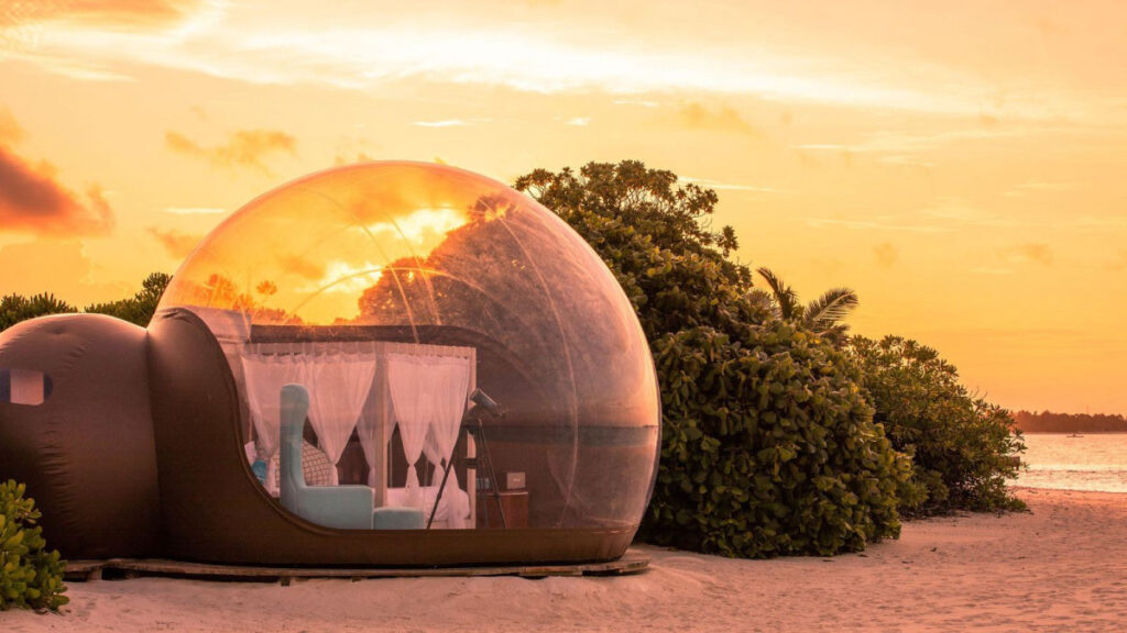 ・ 1.8km に及ぶ砂浜(モルディブ随一の絶景ビーチ)の先にある透明なビーチバブルテントにて、満天の星空の下で蜜にならない究極のプライベートグランピング体験。ディナーBBQ と朝食つき(追加料金 US$700/2 名)
