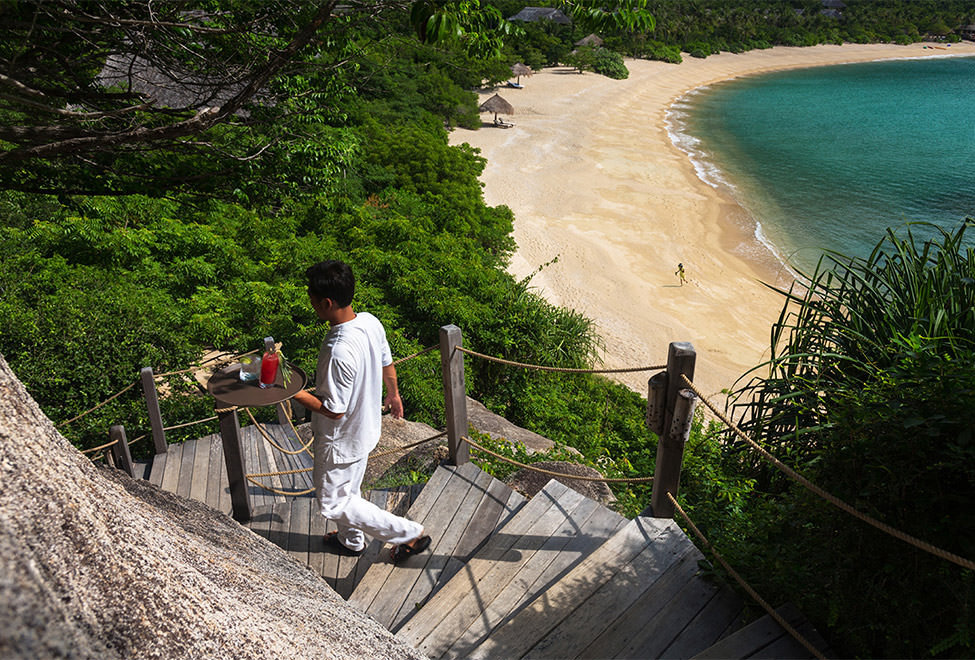 ・ ボートでしかアクセスできない三日月形の湾と金色の砂浜がユニーク。建築様式はベトナムの伝統を取り入れ、環境を意識し、自然を尊重しています。